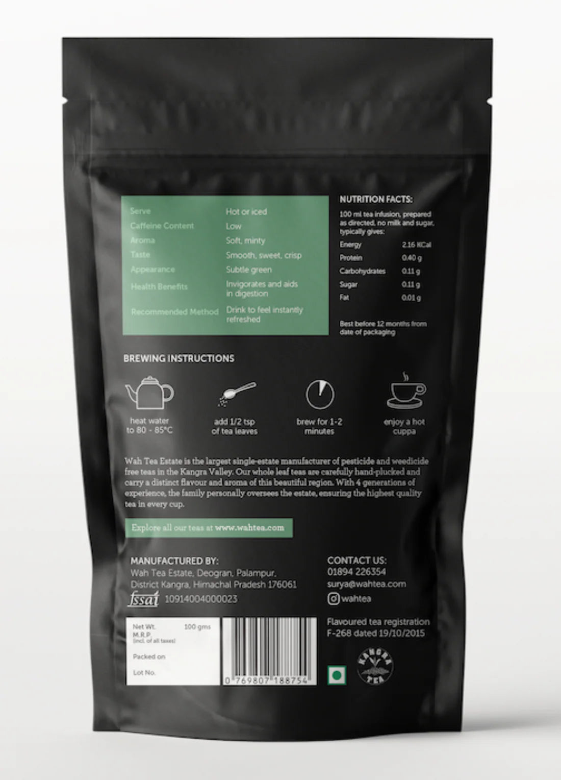 Tea Blend: Whole Leaf Green Tea, Mint Leaves, Natural Mint Flavour.